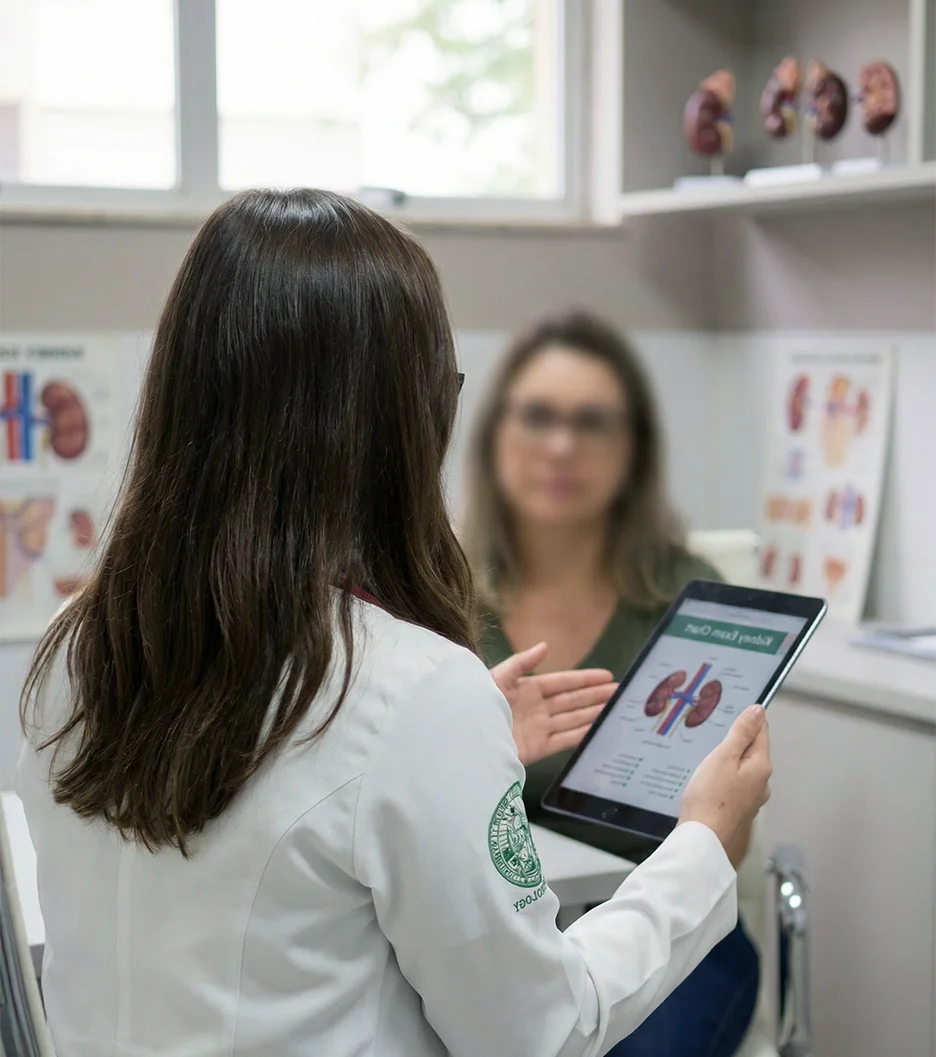 Avaliação detalhada da função renal com análise de exames laboratoriais e de imagem, investigação de sintomas e fatores de risco, além de orientações personalizadas para preservar a saúde dos seus rins.